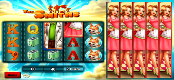Das Abenteuer beginnt! Eine in der Vorstadt lebende Familie (Va-ter, Mutter, Tochter und Hund) ist bei drohender Gefahr sofort zur Stelle und bekämpft als Superhelden das Böse. Das bunte, spannende BALLY WULFF Spiel The Smiths erstreckt sich über gleich 2 Walzenkörper - einer mit 5 Walzen und je drei Symbol-feldern, der andere mit 5 Walzen und sogar je 9 Symbolfeldern -  Gespielt werden kann auf 20, 40, oder 60 Linien.